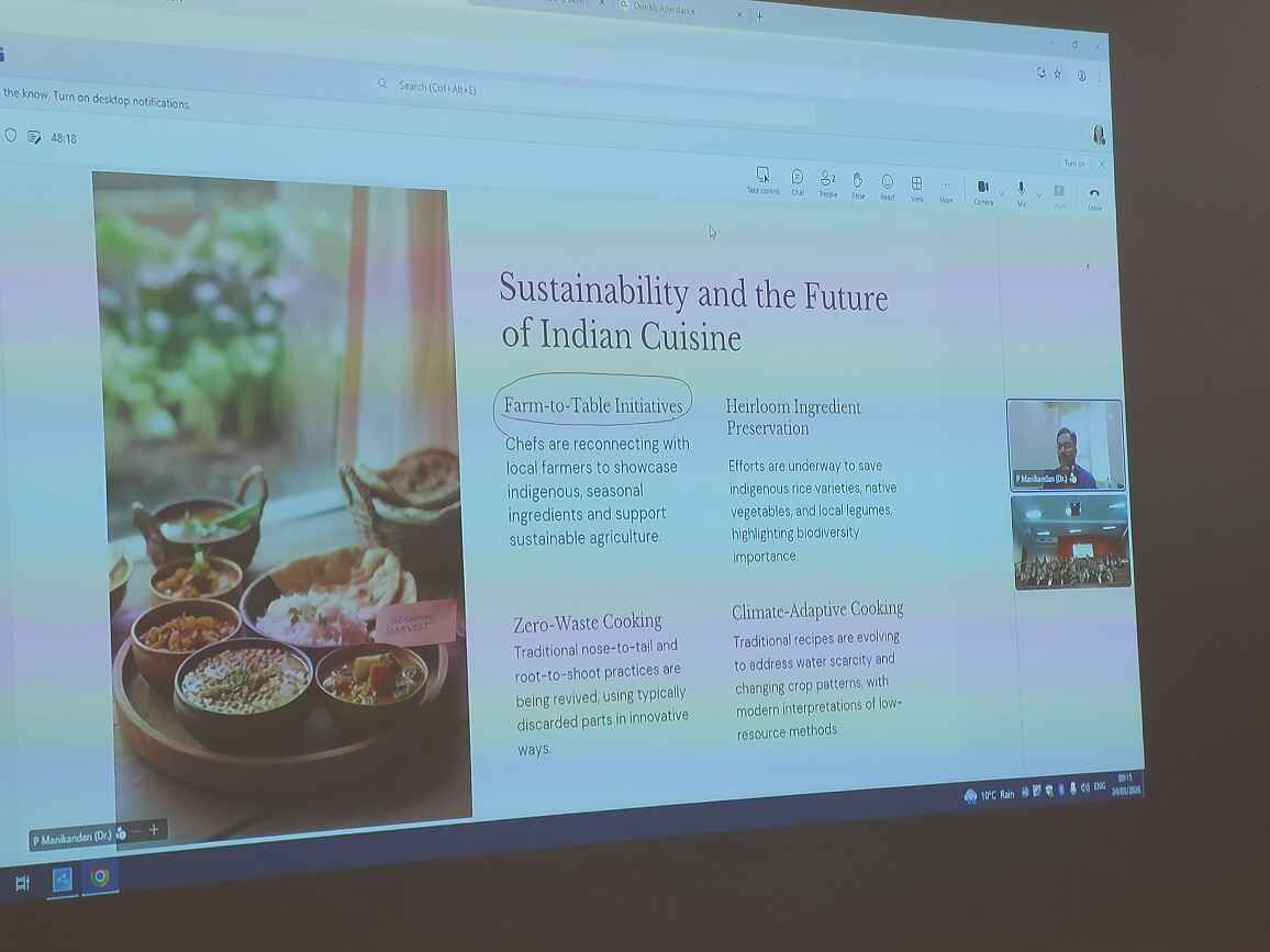 The lecture further addressed the preservation of heirloom ingredients, including indigenous grains, native spices, and traditional rice varieties that reflect India’s culinary biodiversity and cultural heritage. Another important theme was climate-adaptive cooking, demonstrating how recipes and cooking methods have evolved according to regional climatic conditions and seasonal availability. The webinar was facilitated by Sarah Ryan and was well appreciated by faculty and students, with positive feedback received for continued academic engagement.
