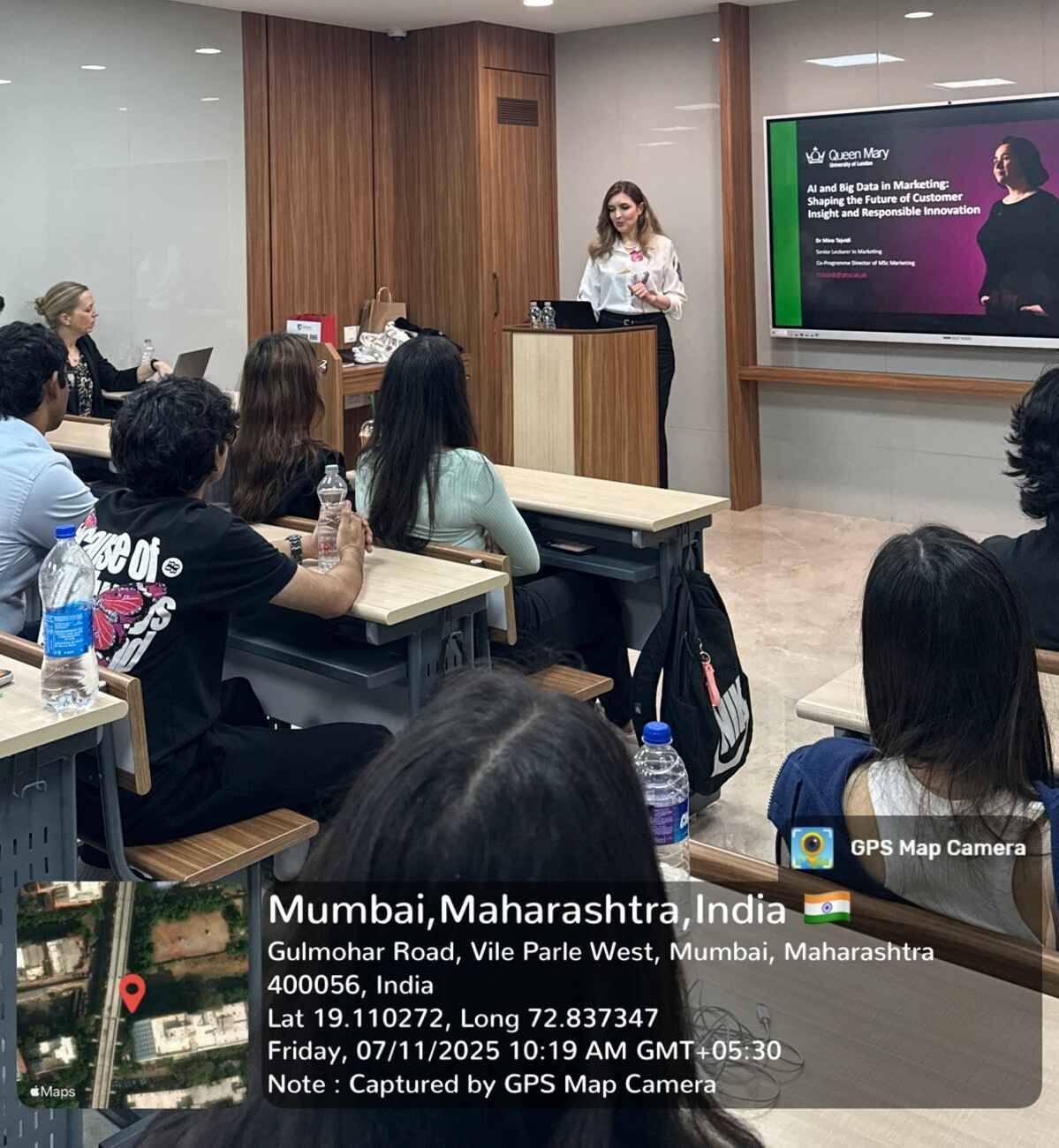 A guest lecture on “AI and Big Data in Marketing: Shaping the Future of Customer Insight and Responsible Innovation” was conducted for the third-year BBA (Branding and Advertising) students on Friday, 7 November 2025. Dr Mina Tajvidi delivered the session from Queen Mary University of London, sharing valuable insights into the evolving role of artificial intelligence (AI) and big data in modern marketing. Dr Tajvidi explained how digital platforms collect and analyse user data to better understand consumer preferences and deliver personalised experiences. Real-world examples, such as Netflix recommending shows based on viewing history and e-commerce sites suggesting products based on purchase behaviour, were used to illustrate the impact of AI-driven analytics. Students were then divided into groups and asked to conceptualise innovative marketing ideas leveraging AI and data insights. Each group presented its idea to the class, with Dr Tajvidi acting as an investor. The most innovative idea was awarded a special gift from Queen Mary University of London.
