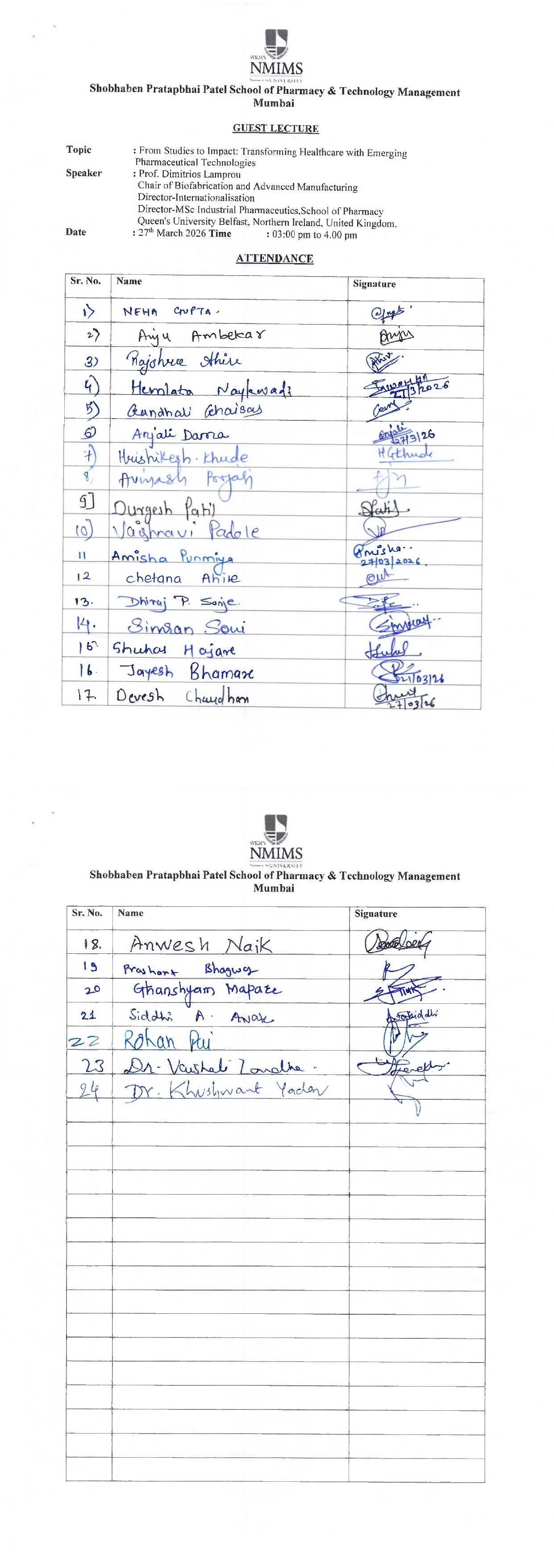 A guest lecture on topic “From Studies to Impact: Transforming Healthcare with Emerging Pharmaceutical Technologies” was organized at Shobhaben Paratapbhai Patel School of Pharmacy & Technology Management, SVKM’s NMIMS, Mumbai on 27th March 2026. The lecture was delivered by Prof. Dimitrios Lamprou, Chair of Bio-fabrication and Advanced Manufacturing, Director of Internationalization and Director of the MSc Industrial Pharmaceutics program at the School of Pharmacy, Queen’s University Belfast, Northern Ireland, United Kingdom.