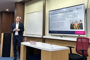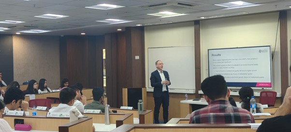 As part of its commitment to providing global academic exposure, PDSE & FBM hosted Professor Michael Stimmelmayr from the University of Bath, UK, for an in-person session titled “Economics in Action” on 2 December 2025. Professor Stimmelmayr, Professor in the Department of Economics and Associate Dean (International), Faculty of Humanities and Social Sciences, shared valuable insights on economic development, microeconomic theory, and the role of institutions in shaping living standards. The session was attended by first-year BBA (Finance) students and proved to be highly engaging and insightful, enriching students’ understanding by connecting theoretical concepts with real-world economic applications.